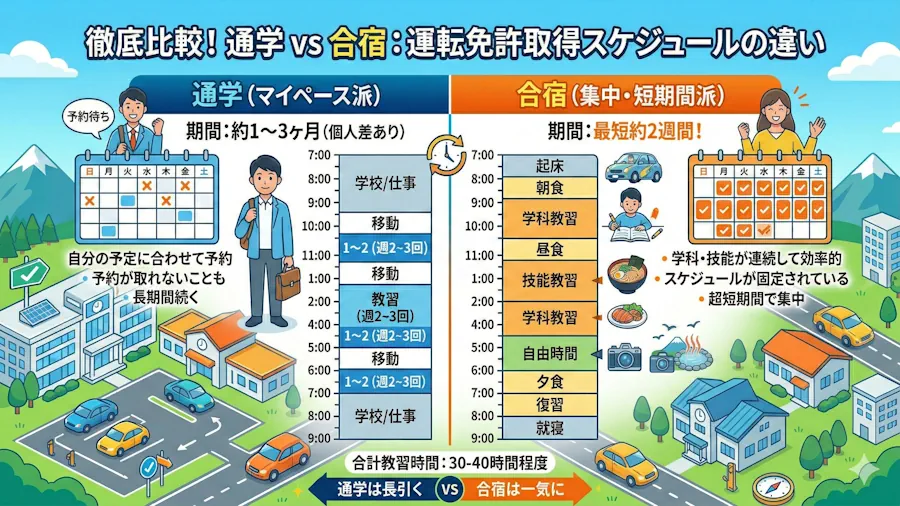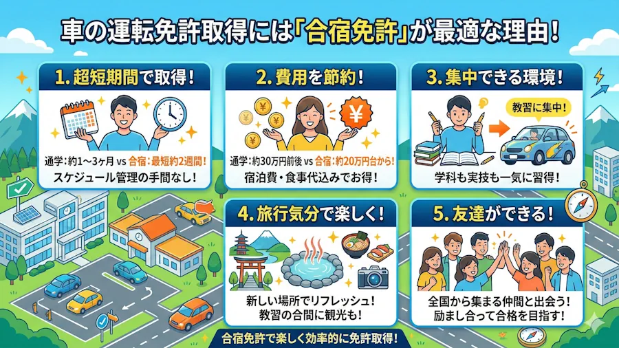 大学生が運転免許を取るなら、地元の教習所に通う「通学」よりも、約2週間泊まり込みで集中して学ぶ「合宿免許」が圧倒的におすすめです。